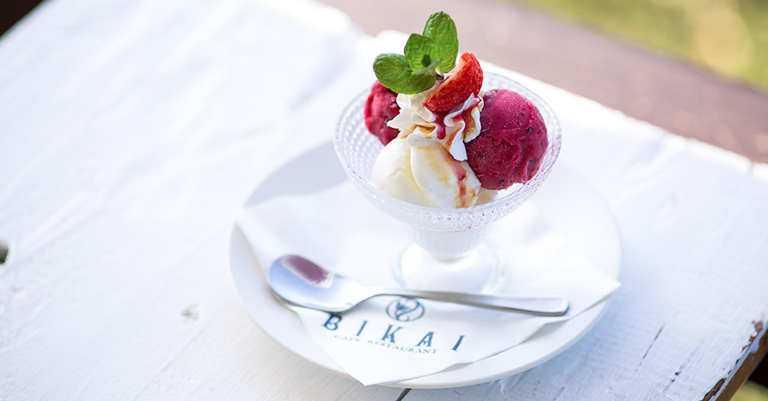 海の青に映える白い外観のBIKAIは店内すべての席から海を見ることができます。『あの夏のあの海を思い出してもらいたい』をコンセプトに精一杯のおもてなしをさせていただきます。BIKAIでの特別な時間を楽しんでください。